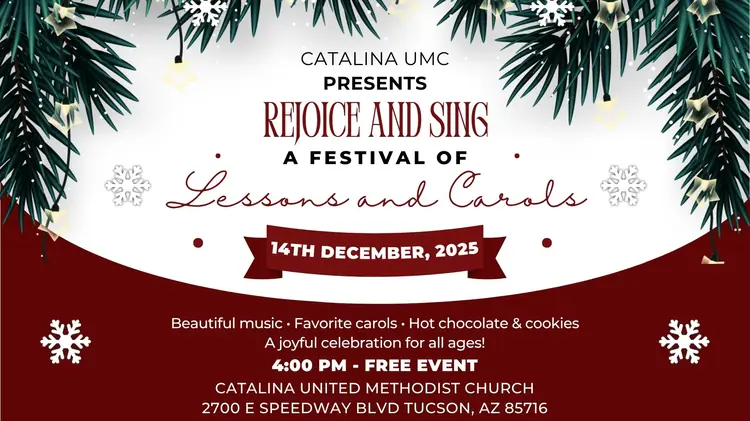 Join us for an early evening Christmas concert “Rejoice and Sing: a Festival of Lessons and Carols” at 4pm on December 14 in our sanctuary. This joyful celebration for all ages will include beautiful music including favorite carols and will end with hot chocolate and cookies. This event is free of c